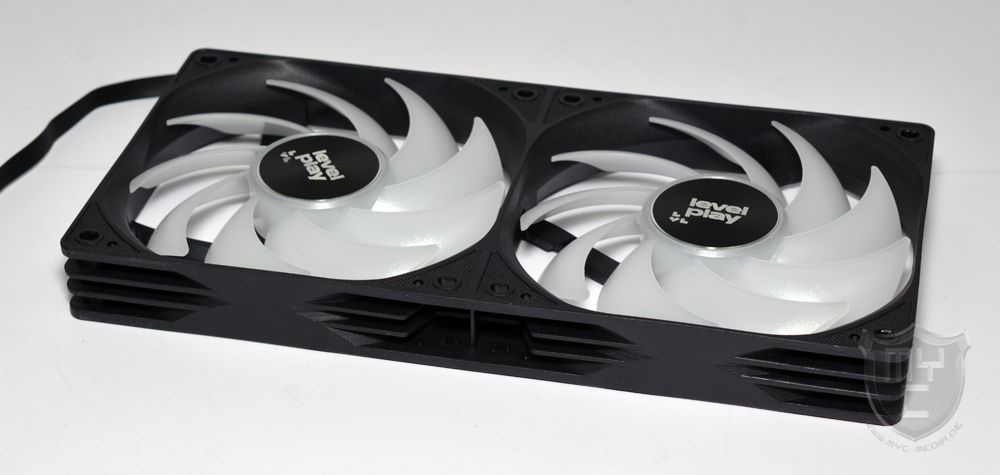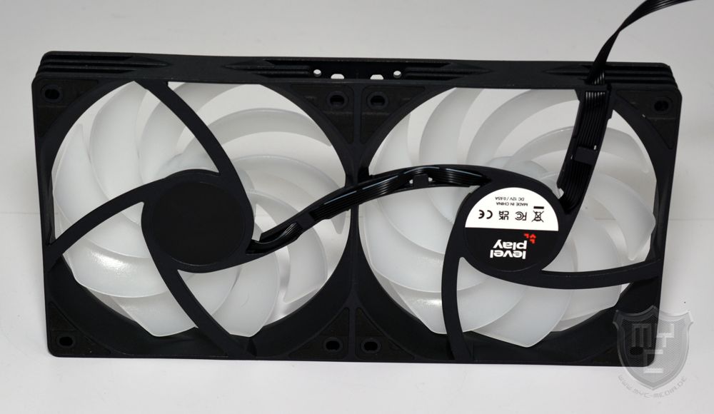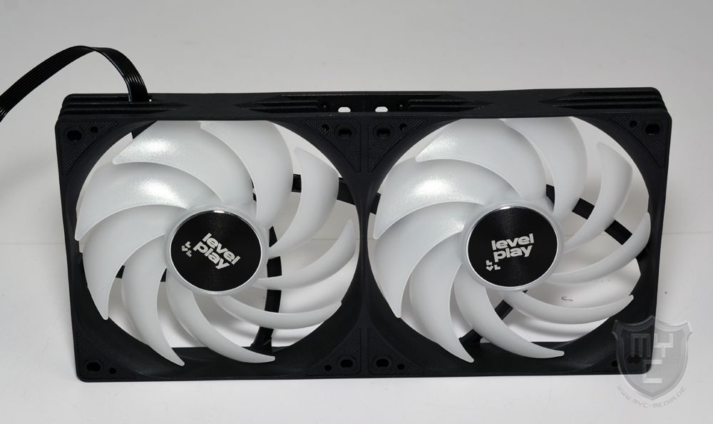 Um den Lüfter bestmöglich an das Design der AiO-Wasserkühlung anzupassen, wurden die beiden mit neun Lüfterblättern ausgestatteten Impeller aus leicht transluzenten Kunststoff gefertigt.