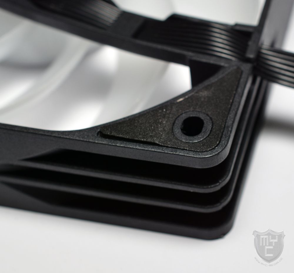 wurde der Lüfterrahmen auf der Rückseite mit Moosgummientkopplern ausgestattet. Diese wurden jedoch so flach und weich ausgeführt, dass sie durch die Montage des Lüfters vollständig zusammengedrückt wurden und der Lüfterrahmen somit ohne eine wirksame Entkopplung auf dem Radiator aufliegt.
