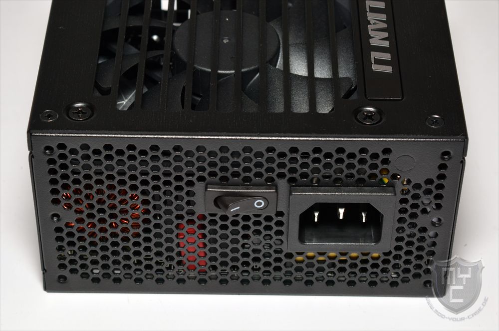 Auf der aus schwarz lackierten Stahlblech gefertigten Vorderseite des Netzteiles findet man neben der obligatorischen Kaltgerätebuchse auch einen keinen Powerschalter vor. Zudem wurde das Netzteil auf der Vorderseite mit einem Luftauslass ausgestattet.