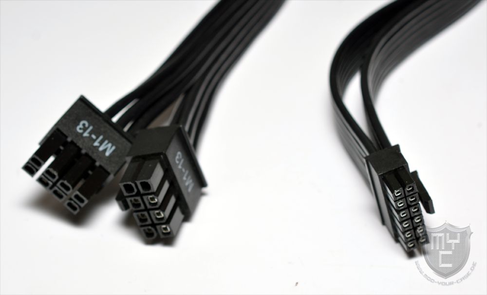 Anstelle der beiden Kabel, über welche die drei 6+2-PIN-PCIe-Anschlüsse bereitgestellt werden, kann man auch auf das im Lieferumfang enthaltene Kabel zurückgreifen, welches einen 12VHPWR (12-PIN PCIe 5.0 Stromanschluss) bereitstellt. Somit ist das Netzteil ohne zusätzliche Adapter zu Founders Edition Karten von NVIDIA sowie zukünftige Grafikkarten kompatibel.