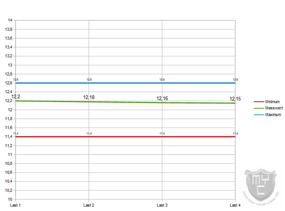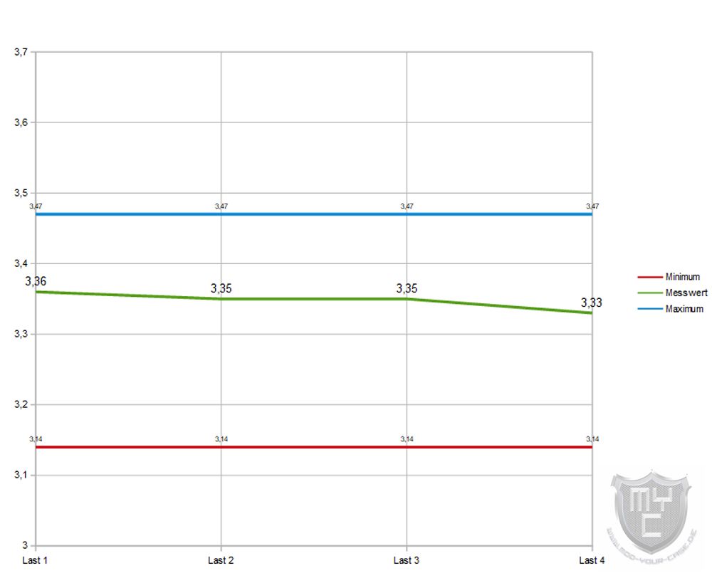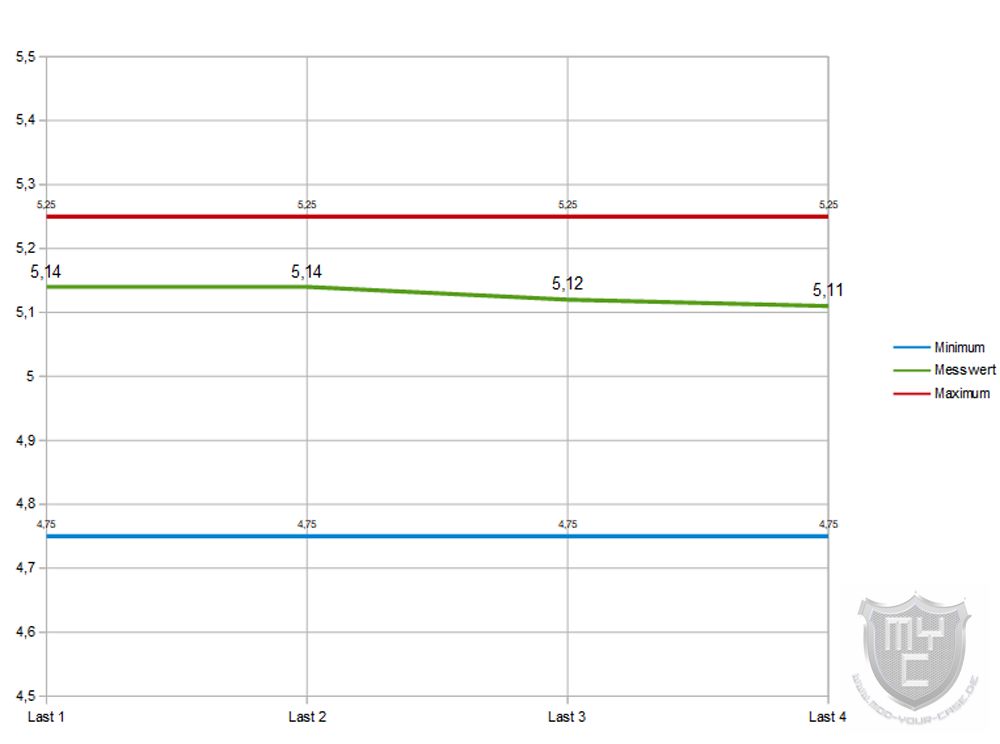 Mit einem Blick auf das Testergebnis wird man erkennen, dass alle in diesem Test gemessenen Spannungen beim Wechsel zwischen den einzelnen Laststufen immer minimal abgesackt sind. Dies ist jedoch in dem von uns gemessenen Rahmen vollkommen bedenkenlos, denn die gemessenen Spannungen lagen zu jeder Zeit im Toleranzbereich der ATX-Norm und hatten auch keine Einwirkungen auf die Stabilität unseres Testsystems.