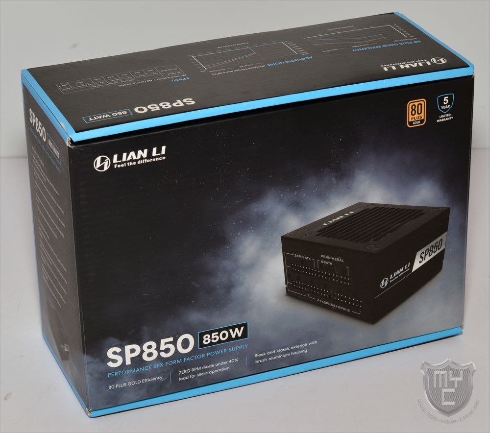 Das SP850 SFX Netzteil wird von LIAN LI in einer Verpackung geliefert, welche in einem dunklen Grunddesign gehalten ist und auf der Verpackungsvorderseite neben einem Produktbild und der Modellbezeichnung auch mit einem Hinweis auf die Effizienz sowie die maximale Ausgangsleistung bedruckt wurde.