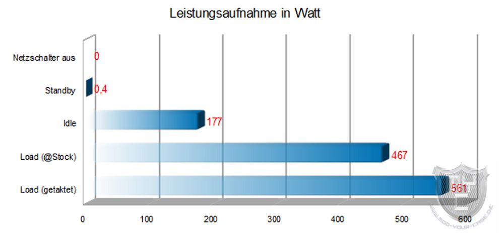 Das o. g. System inkl. Netzteil weist einen Strombedarf von etwa 170 Watt (IDLE) bis ca. 560 Watt (Volllast übertaktet) auf. Dieser kann jedoch je nach verwendetem Netzteil unterschiedlich sein. Unter Volllast wird besonders auf die Stabilität der Spannungen geachtet.