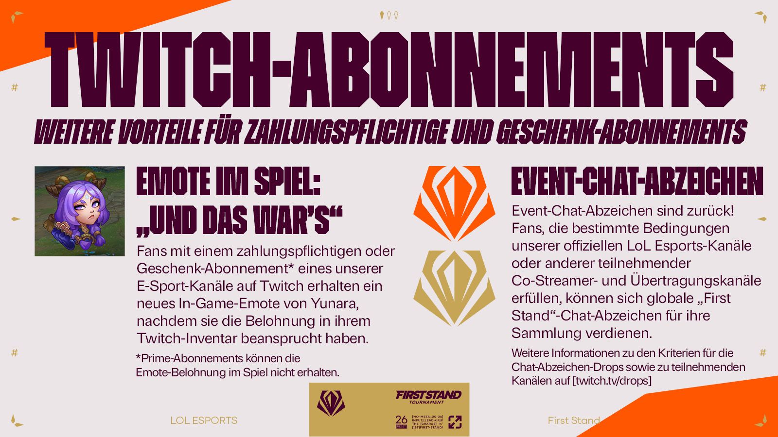 Drops sind weltweit verfügbar – unabhängig vom Aufenthaltsort. Beim Zuschauen über LoLEsports.com und eingeloggtem Riot-Konto können während des gesamten Turniers Drops verdient werden. Dazu zählt ein exklusives Evelynn-Emote, das während des Finales droppt. Twitch-Abonnenten teilnehmender LoL Esports-Twitch-Kanäle (u.a. twitch.tv/riotgames) erhalten weitere Boni, zudem können auch zwei globale First-Stand-Chat-Badges freigeschaltet werden. Ein Teil der Einnahmen fließt in den Global Revenue Pool zur Unterstützung von Ligen und Teams.