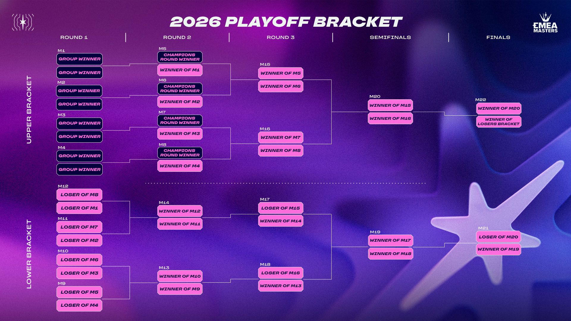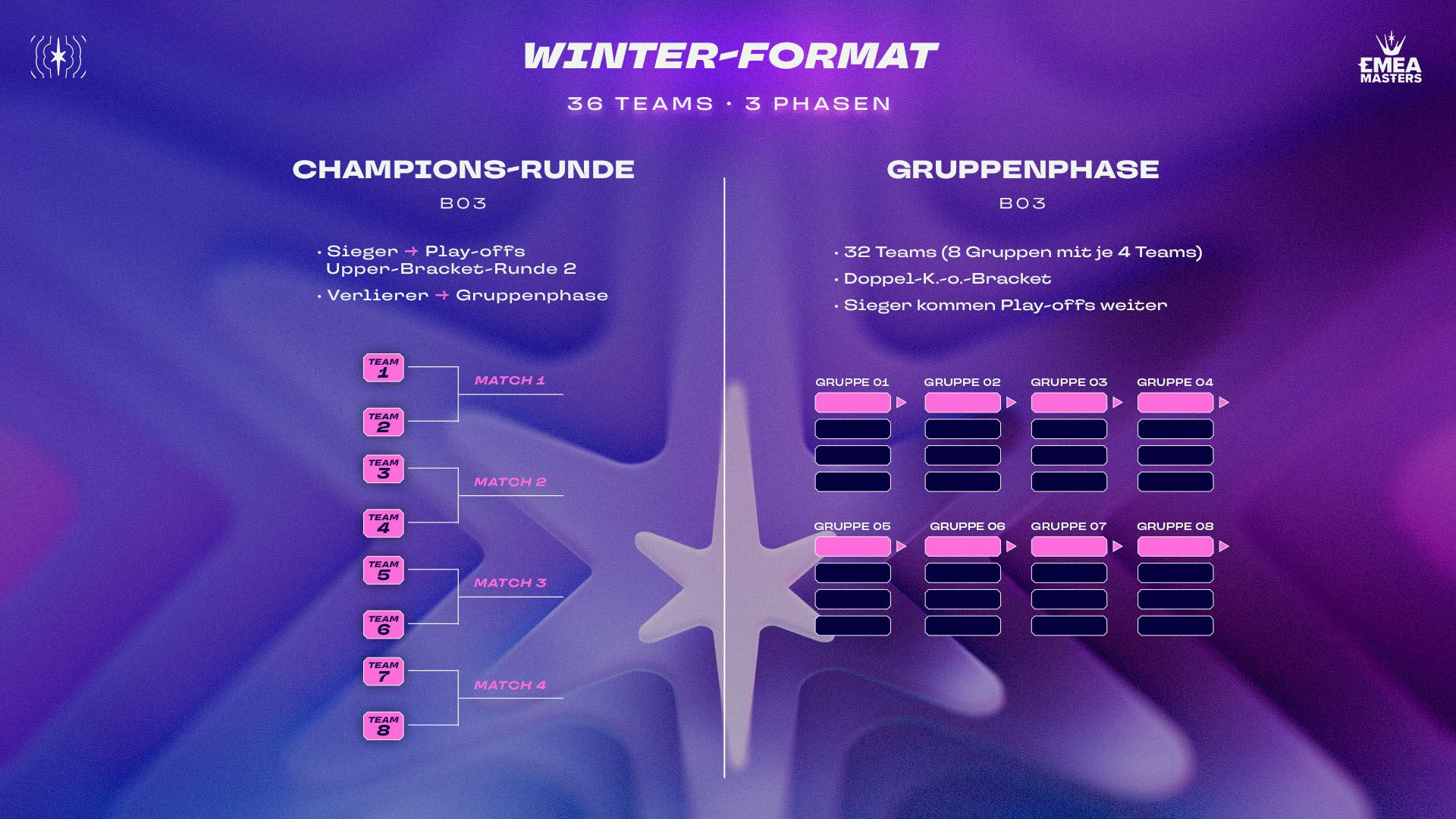 Auch das Turnierformat des EMEA Masters Winter wurde weiterentwickelt. Insgesamt 36 Teams treten in drei aufeinanderfolgenden Phasen gegeneinander an. Den Auftakt bildet am 09. März 2026 die sogenannte Champion-Runde, in der die Winter-Split-Champions der acht bestplatzierten europäischen Regionalligen in Best-of-3-Duellen aufeinandertreffen. Die vier siegreichen Teams qualifizieren sich direkt für die zweite Upper-Bracket-Runde der Play-offs, während die unterlegenen Teams ihren Weg über die Gruppenphase fortsetzen müssen.