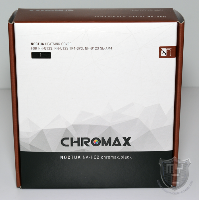 Die NA-HC2 chromax.black bzw. withe Kühlerabdeckungen werden von Noctua jeweils in einer Verpackung geliefert, welche in einer weiß/braunen Farbgebung gehalten ist. Auf der Verpackungsvorderseite ist neben der Modellbezeichnung auch noch eine Auflistung der kompatiblen Kühler zu finden.