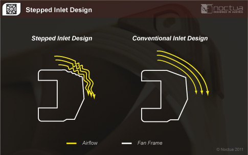 Die abgestufte Einlaufstruktur des Stepped Inlet Designs ist eine innovative Konstruktionstechnik, die erstmals mit Noctuas NF-F12 eingeführt wurde. Sie erleichtert den Übergang von laminarer zu turbulenter Strömung und hat eine ähnliche Wirkung wie die Dimple-Struktur eines Golfballs: In beiden Fällen wird ein besseres Flow Attachment, d.h. ein besseres Anhaften der Strömung am umströmten Volumenkörper erzielt. Durch die besser am Rahmen anliegende turbulente Strömung kann der Rotor mehr Luft ansaugen und eine höhere Förderleistung erzielen.
