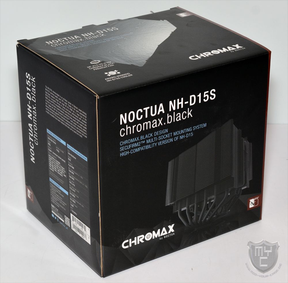 Der neue NH-D15S chromax.black wird in einer Verpackung geliefert, welche in einem schwarzen Design gehalten ist. Die Verpackungsvorder- als auch Oberseite wurde neben der Modellbezeichnung und einem Produktbild auch mit einer kurzen Beschreibung bedruckt.