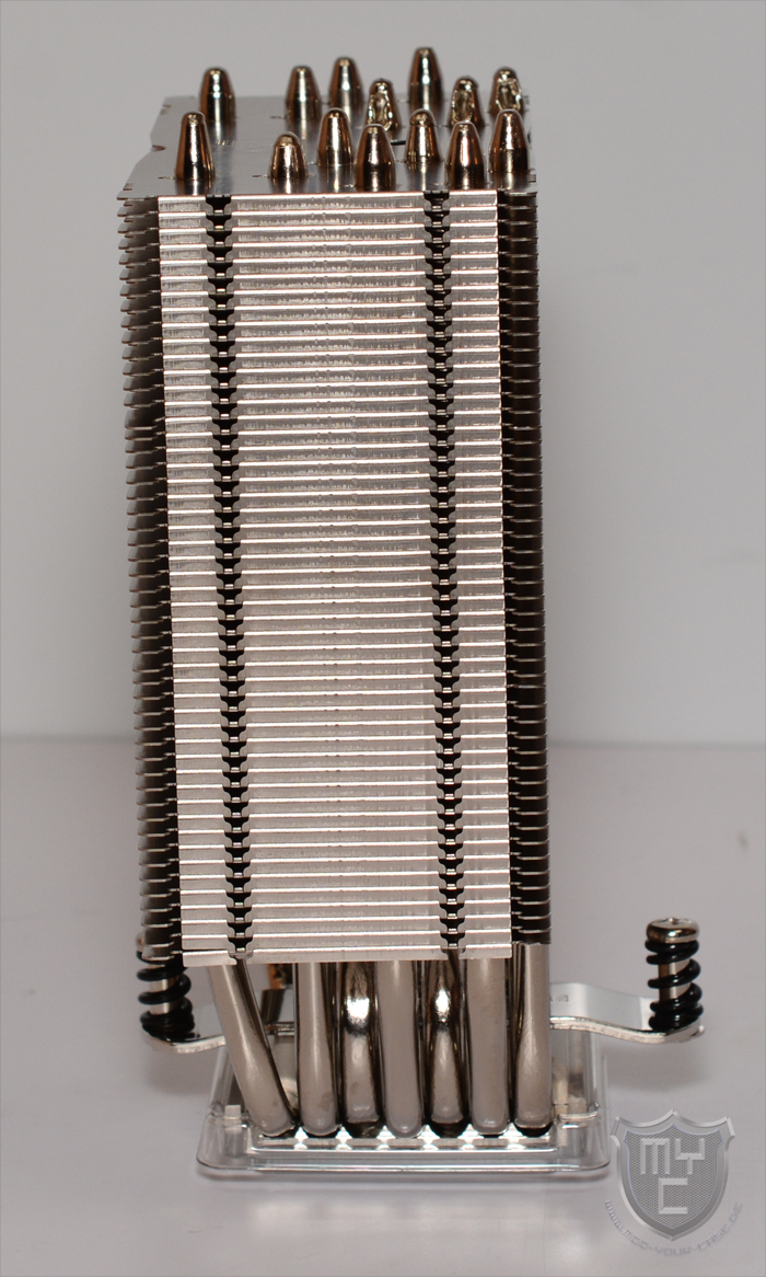 Die sieben verbauten Heatpipes durchlaufen die zweiteilige Bodenplatte u-förmig gebogen. Um eine größere Oberfläche zu erzielen, wurden die Heatpipes leicht versetzt zueinander in die Kühlfinnen geführt.