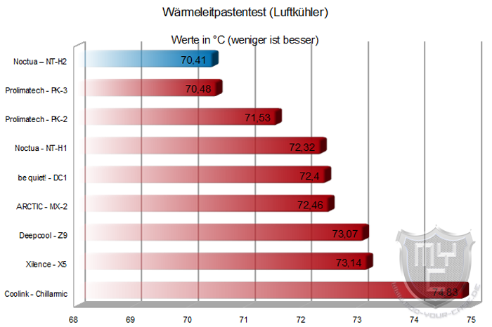 Mit einem Blick auf das Testergebnis ist zu erkennen, dass die neue NT-H2 Wärmeleitpaste sich klar vor der NT-H1 platzieren konnte. Den größten Leistungsunterschied gibt es jedoch bei einer hohen Temperatur, wie sie beim Einsatz eines Luftkühlers erreicht wird.