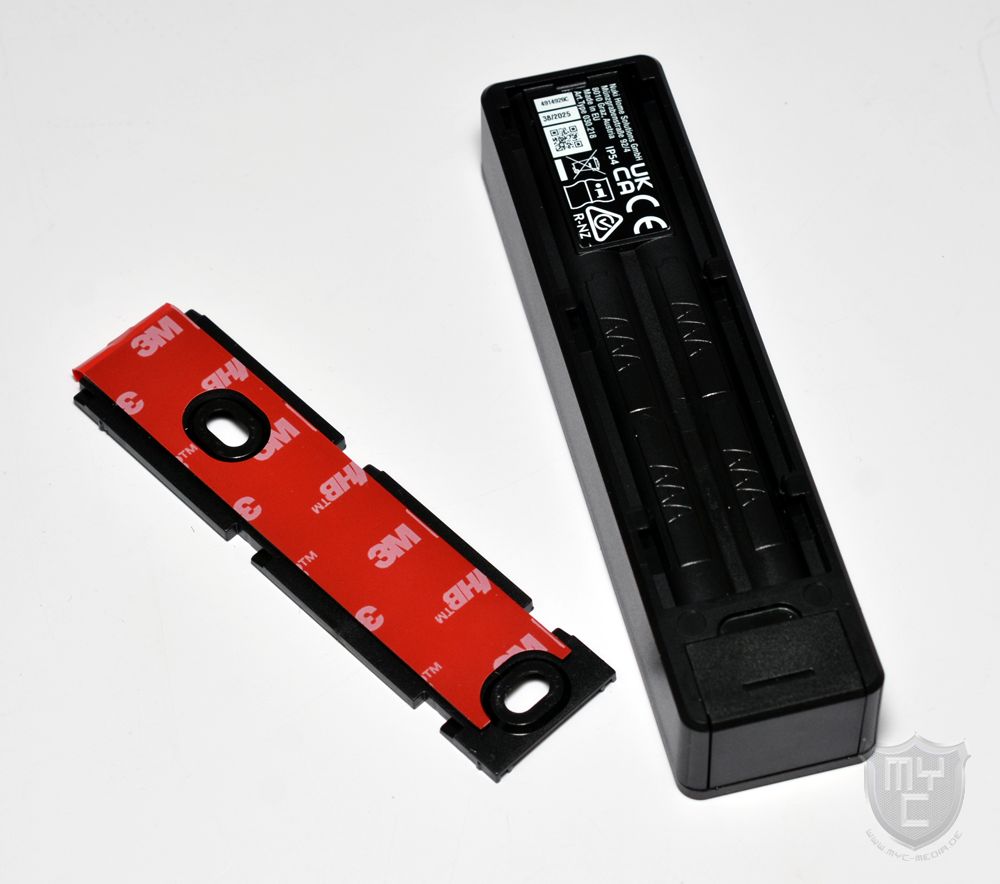 Mit einem Blick auf die Rückseite des schwarzen Kunststoffgehäuses findet man eine aufgeschobene Montageblende vor. Diese wurde zur Montage des Keypad 2 nicht nur mit zwei Montagebohrungen ausgestattet, sondern auch mit einem doppelseitigen Klebepad, welches auf Wunsch eine werkzeuglose Montage ermöglicht.
