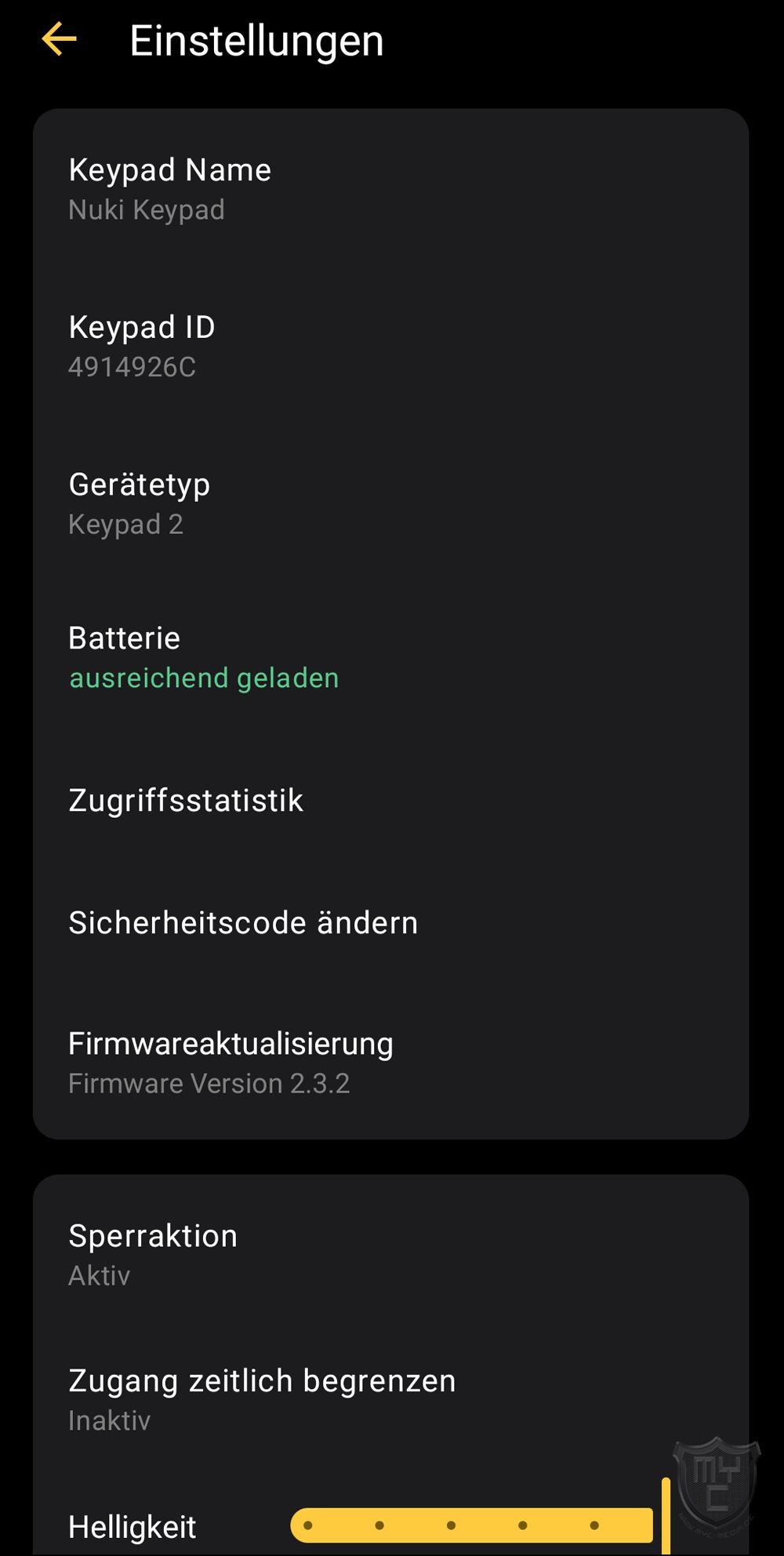 Ruft man das Einstellungsmenü des Keypads auf, so bekommt man neben der aktuell installierten Firmwareversion auch den Status der Stromversorgung angezeigt. Zusätzlich lässt sich über dieses Menü die Keypadbezeichnung und der hinterlegte Sicherheitscode ändern sowie eine Zugriffsstatistik anzeigen.