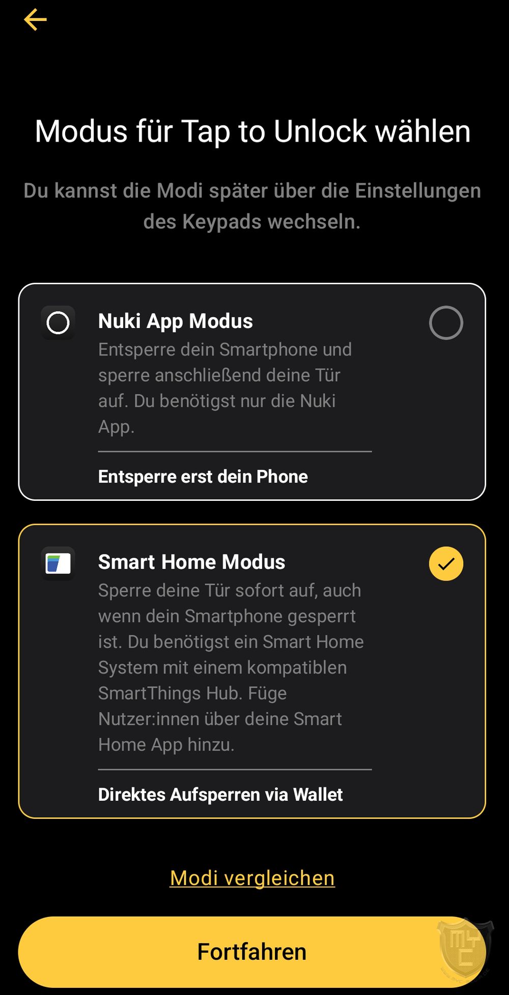 Wählt man an dieser Stelle den Nuki Modus aus, so wird zwar keine gesonderte Hardware benötigt, jedoch muss man ein Smartphone mit installierter Nuki App entsperren und anschließend an das Keypad 2 NFC halten, um den Schließvorgang zu starten. Im Smart Home Modus reicht es hingegen aus, ein gesperrtes Smartphone an das Keypad 2 NFC zu halten.