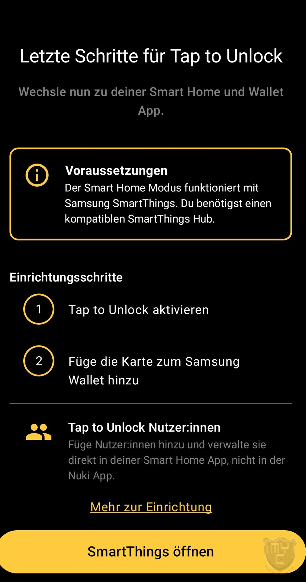 Nachdem man die entsprechende Auswahl getroffen hat, zeigt einem die Nuki App die nächsten Einrichtungsschritte an, welche man nicht mehr in der Nuki App vornimmt, sondern in der SmartThings App.