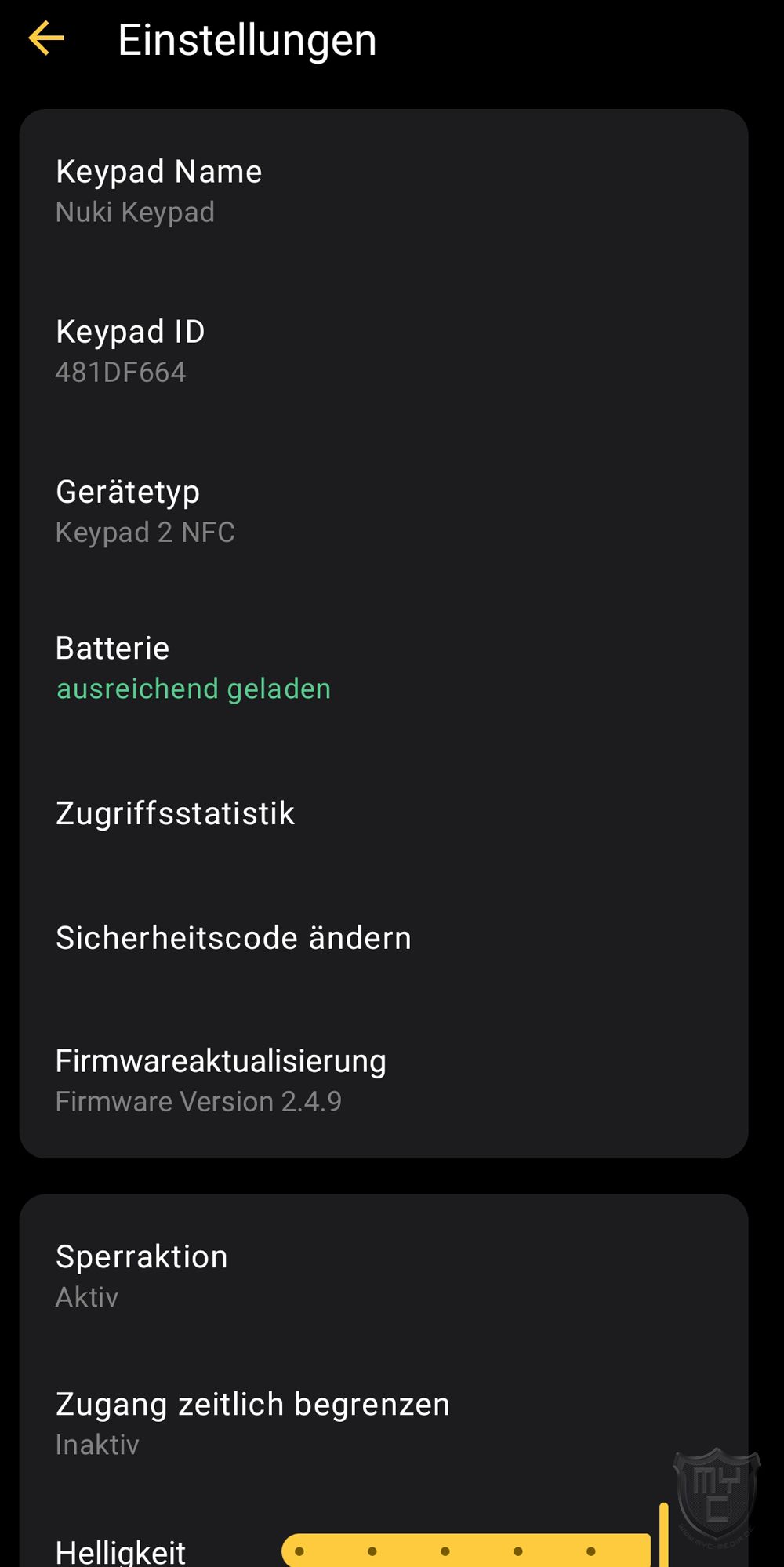 Über den unteren Bereich des Einstellungsmenüs kann man die Einstellungen zur Sperraktion anpassen sowie die Nutzung des Keypads selbst zeitlich begrenzen. Zudem kann an dieser Stelle auch die Helligkeit der integrierten Beleuchtung angepasst und das Keypad zurückgesetzt bzw. aus der Konfiguration entfernt werden.