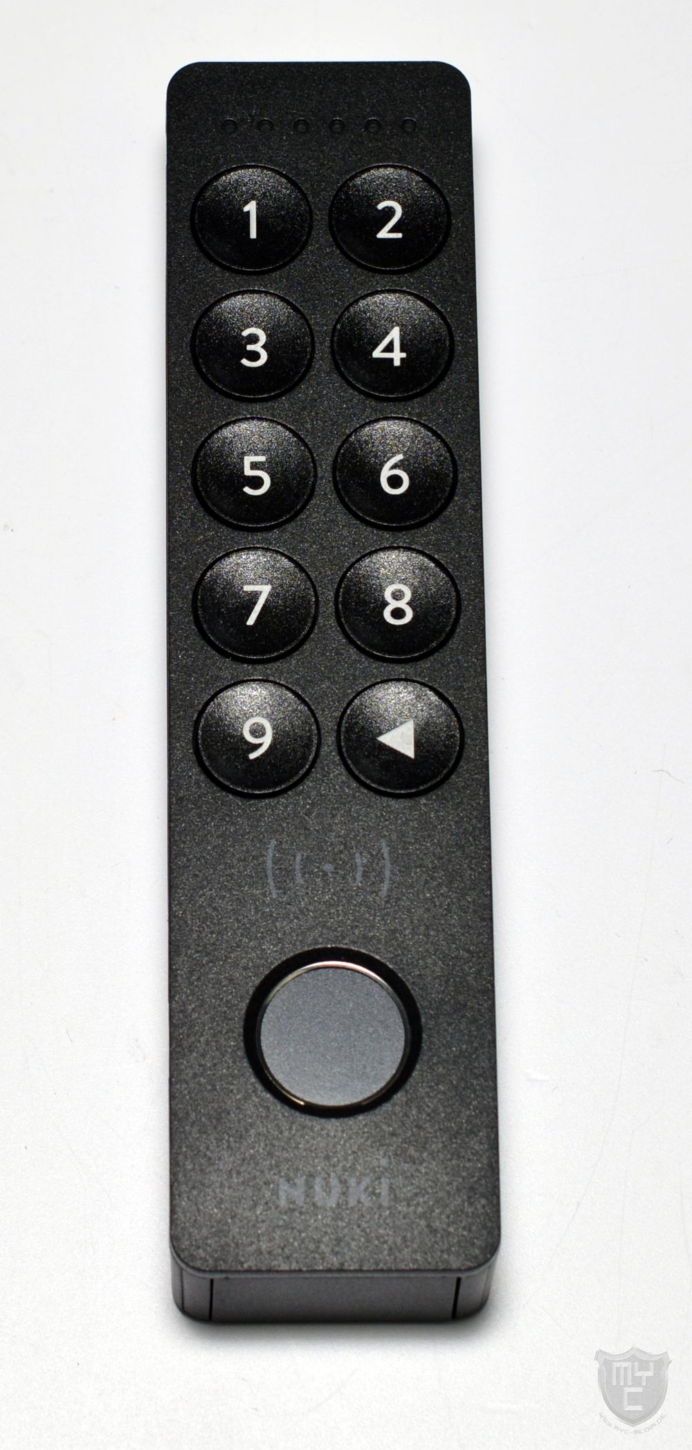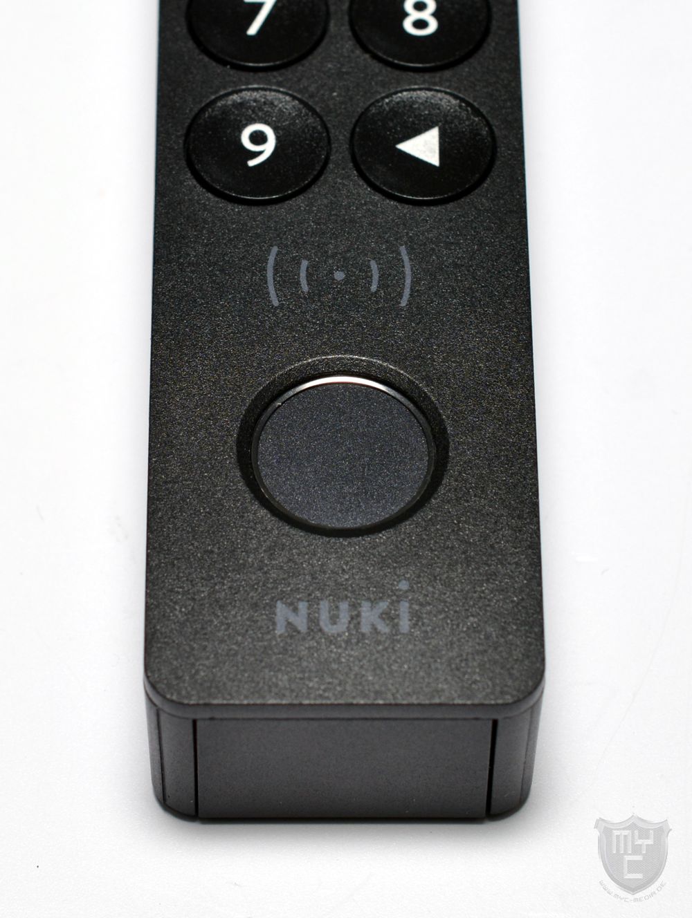 Unterhalb des Tastenfeldes wurde das Keypad 2 NFC nicht nur mit einem Fingerabdrucksensor ausgestattet und mit einem Nuki Logo bedruckt, sondern zwischen dem Fingerabdrucksensor sowie dem Tastenfeld wurde auch ein Funksymbol abgedruckt, welches einem einen Hinweis auf das dahinter verbaute NFC-Modul gibt.
