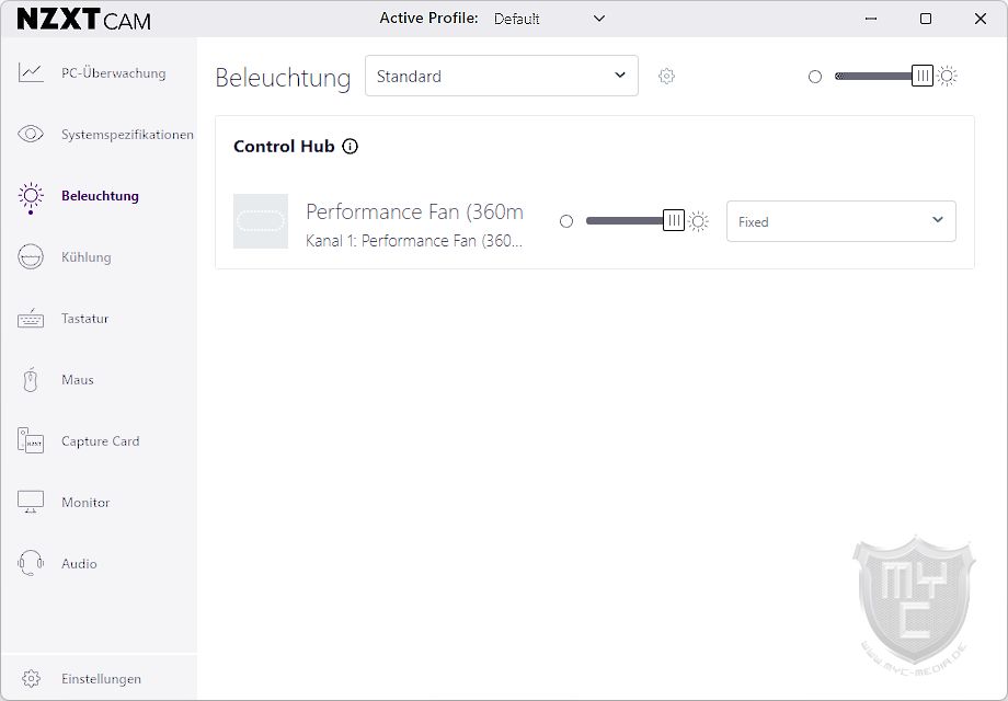 Wie wir es schon von anderen RGB-Komponenten von NZXT kennen, ist die Steuerung der integrierten Beleuchtung über den Menüpunkt “Beleuchtung” der CAM Software möglich.