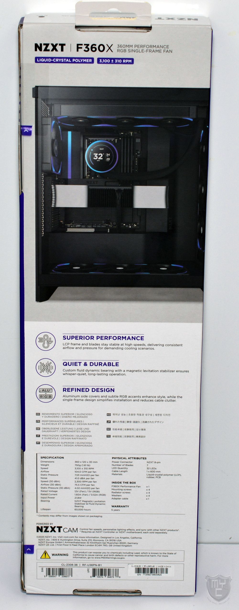Hierbei wurde der F360X Performance RGB-Einzelrahmenlüfter mit einem 360 mm langen und 120 mm breiten Lüfterrahmen ausgestattet, welcher zum größten Teil aus schwarzem Flüssigkristallpolymer (LCP) gefertigt wurde.
