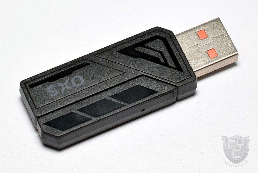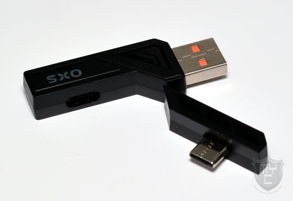 Wie wir es auch schon vom USB-Dongle des STORM G2 Gaming-Headsets aus dem Hause OXS her kennen, handelt es sich auch bei diesem USB-Dongle um einen 2-in-1-Dongle. Wo der größte Teil des USB-Dongles einfach nur als Adapter von USB-A auf USB-C fungiert, wurde die eigentliche Funktechnik in einem kleinen USB-C-Dongle untergebracht, welcher seitlich in den USB-Adapter eingesteckt ist. Durch diesen Aufbau kann der Dongle auch problemlos mit einer mobilen Spielekonsole oder Smartphone genutzt werden.