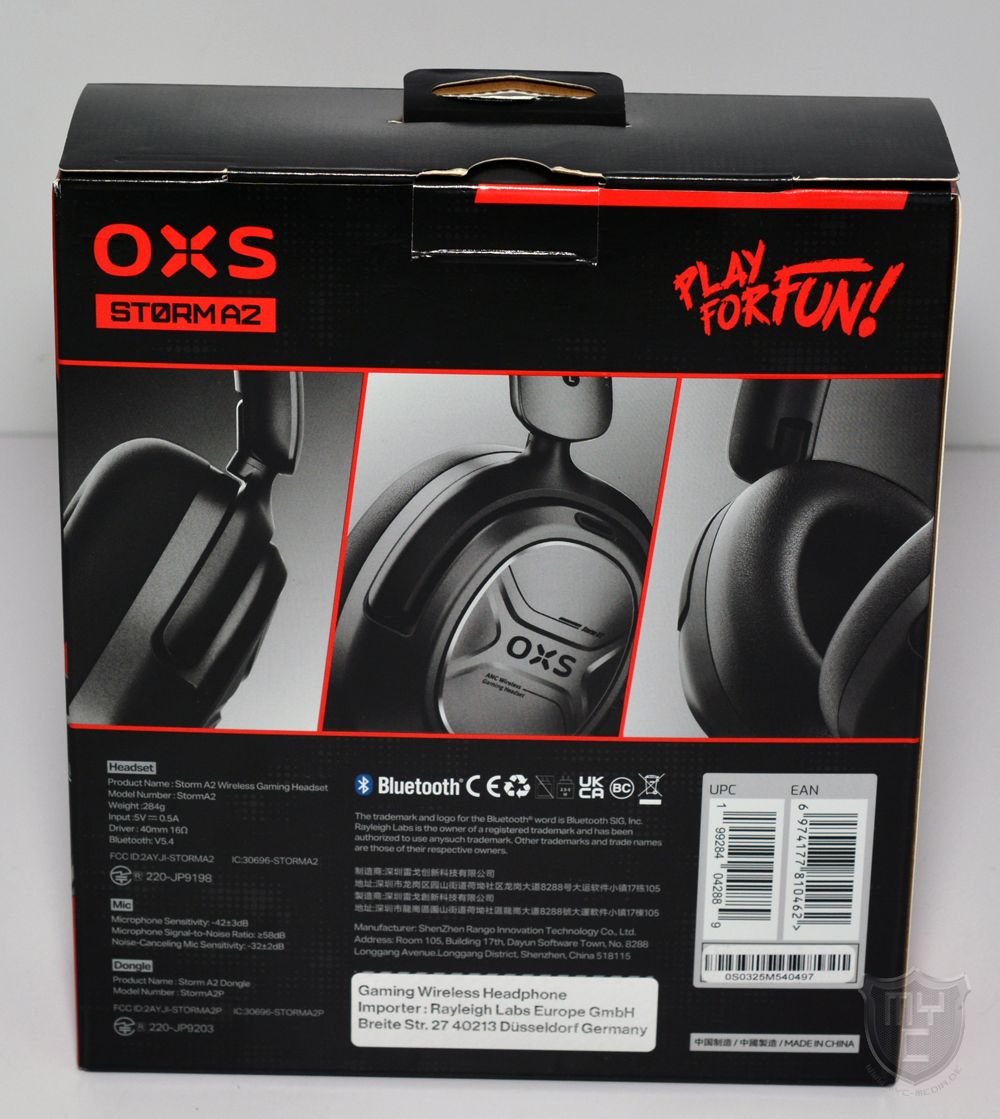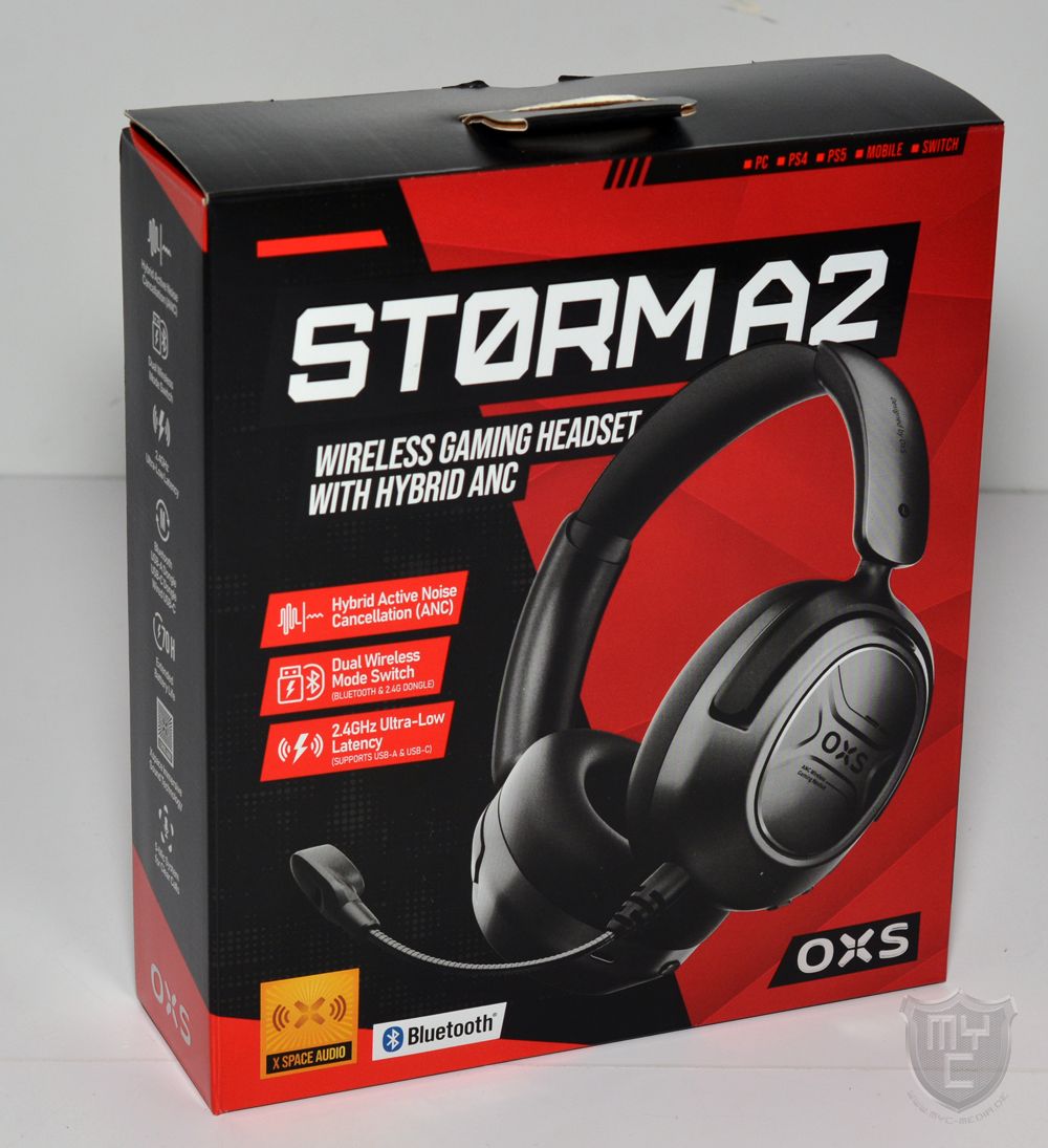 Das STORM A2 wireless Headset wird von OXS in einer Verpackung geliefert, welche in einer rot/schwarzen Farbgebung gehalten ist und auf der Vorderseite neben der Modellbezeichnung sowie einem Produktbild auch mit einem Hinweis auf die Kompatibilität bedruckt wurde.
