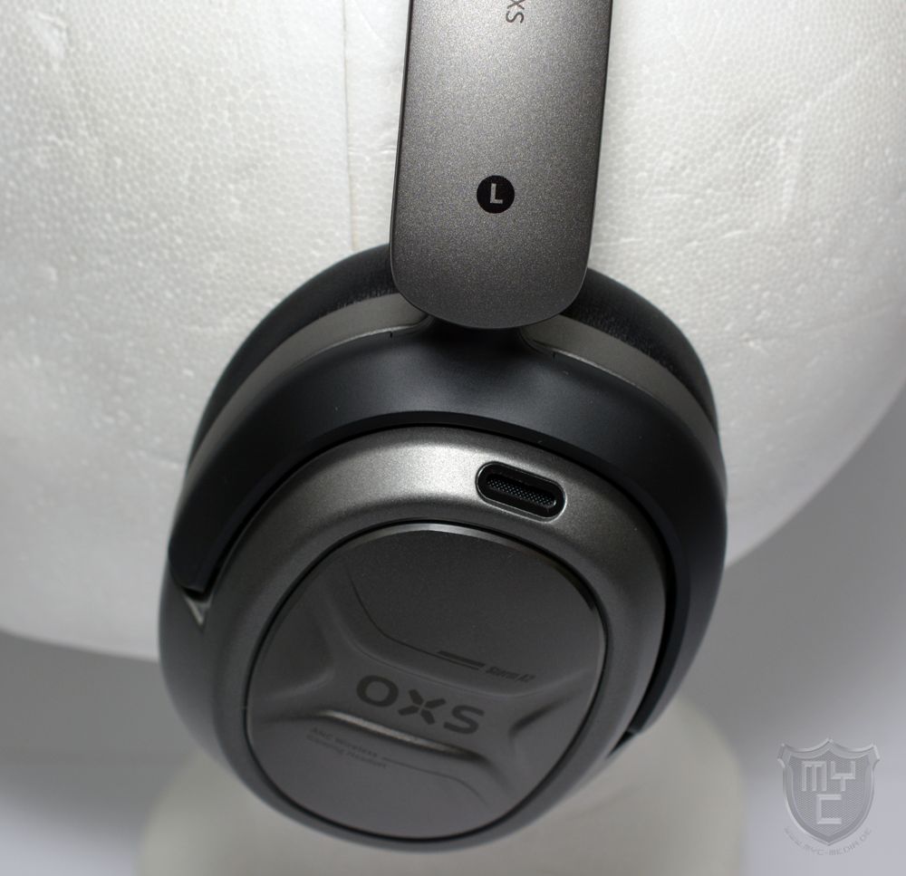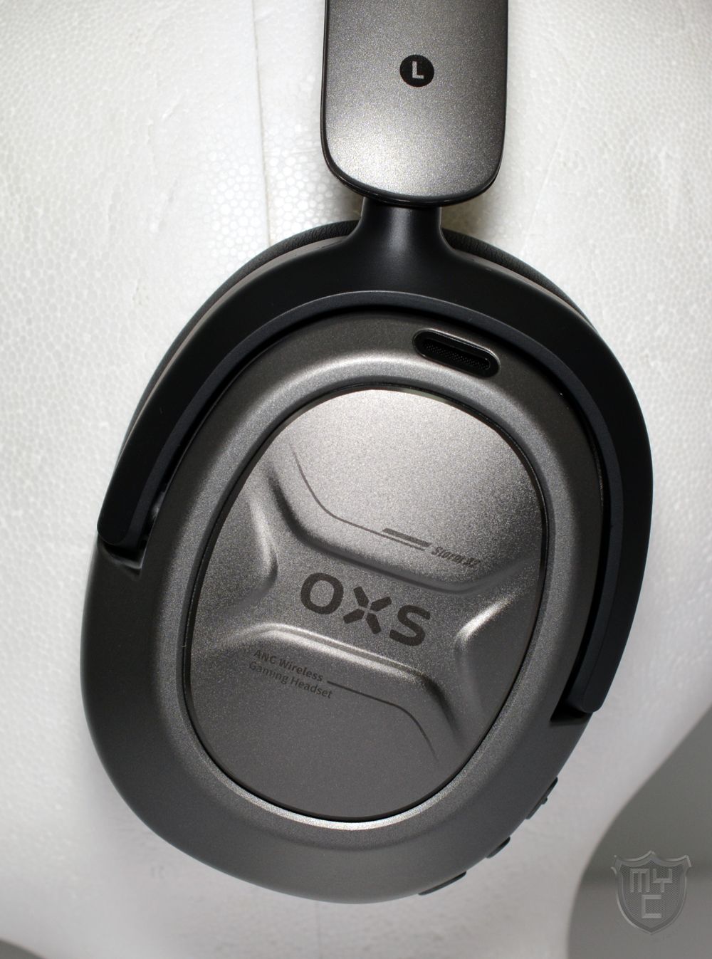 In den äußeren Rahmen der Ohrmuscheln hat OXS eine farblich auf das Headset abgestimmte Aluminiumplatte eingelassen, welche neben einem dezenten Aufdruck auch mit einem eingeprägten X versehen wurde.