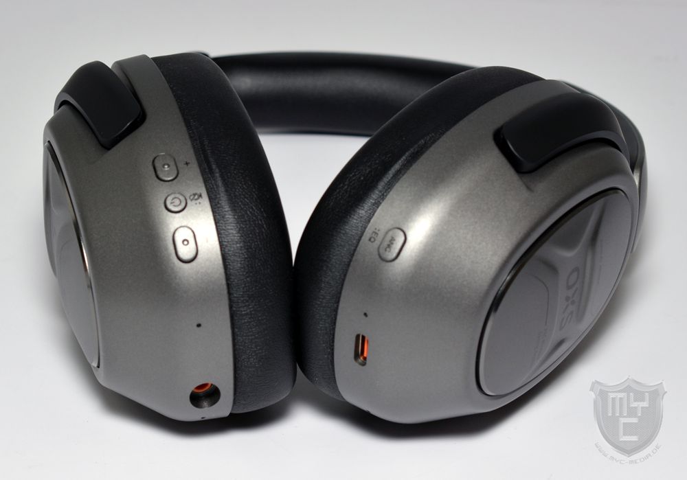 Die rechte Ohrmuschel wurde an dieser Stelle neben einem USB-C-Anschluss, welcher zum Aufladen des integrierten Akkus sowie auch zur Nutzung der integrierten USB-Soundkarte dient, auch mit einer Taste ausgestattet, über welche sich der integrierte Equalizer sowie die Hybrid-ANC-Funktion steuern und die Eingangsquelle auswählen lässt.