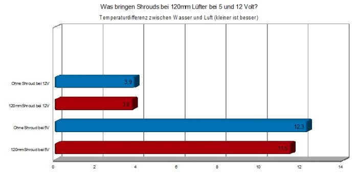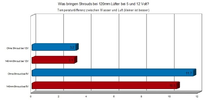 Wie man den beiden Grafiken entnehmen kann, bringen die Vorkammern bei jeder Lüfterdrehzahl eine Steigerung der Kühlleistung. Bei hohen Drehzahlen machen sich die Shrouds noch nicht großartig bemerkbar. Bei niedrigen Drehzahlen ist ein deutlicherer Unterschied zwischen Wasser und Umgebungstemperatur zu erkennen.