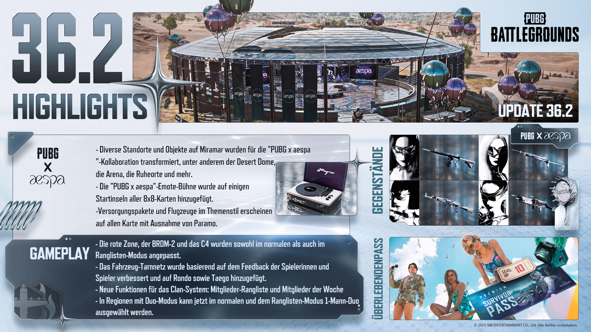 KRAFTON, Inc. veröffentlicht heute Update 36.2 für PUBG: BATTLEGROUNDS auf PC, die Konsolenversion folgt am 17. Juli. Dieses Update führt die mit Spannung erwartete Zusammenarbeit mit der K-Pop-Gruppe aespa ein. Außerdem beinhaltet es Gameplay-Updates, darunter Verbesserungen der Fahrzeug-Tarnnetze und neue Clan-Features. Die vollständigen Patchnotes sind auf der offiziellen Website zu finden.