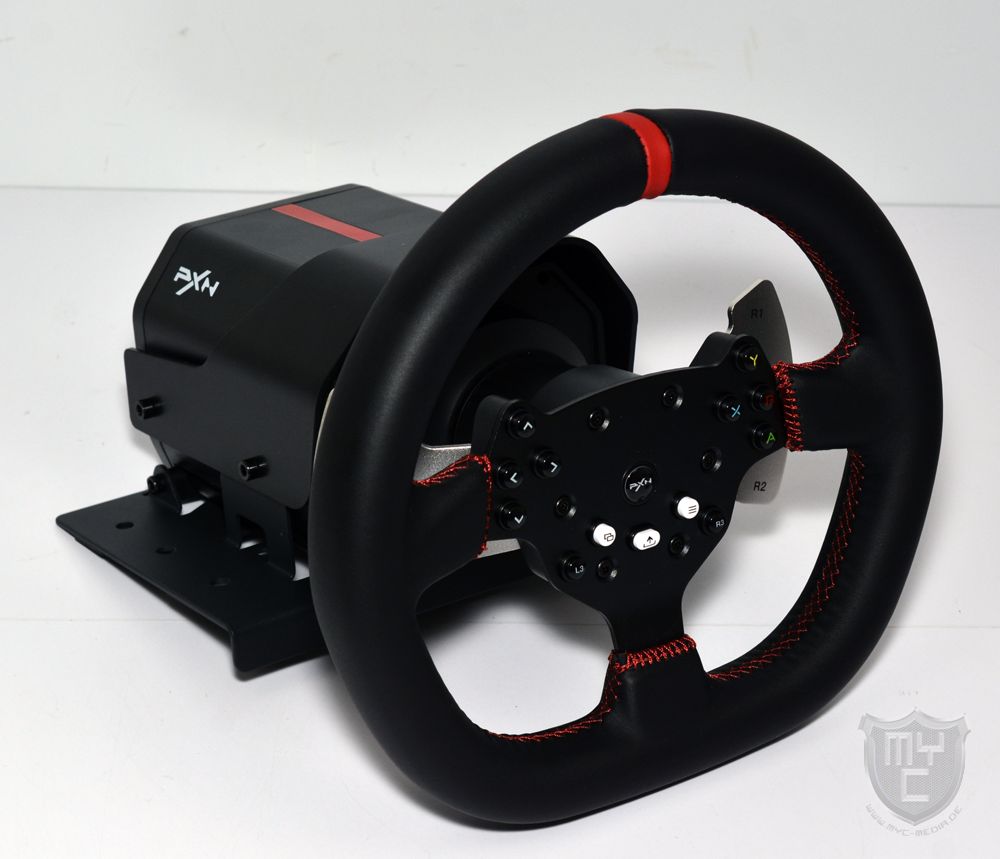 Als Lenkrad liegt dem Set seitens PXN ein mit schwarzem Kunstleder bezogenes Lenkrad bei, welches mit einem Durchmesser von 27 cm im Gegensatz zu einem Lenkrad aus einem echten Auto vergleichsweise kompakt ausfällt.