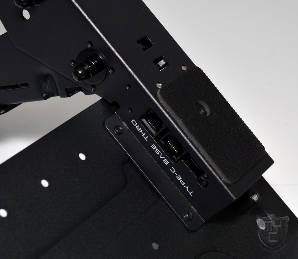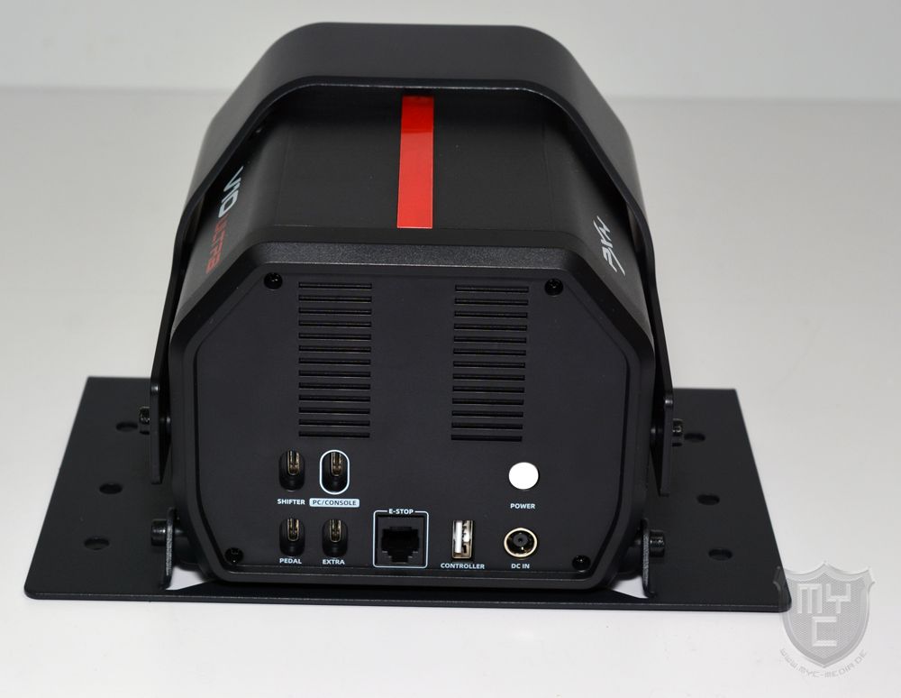 Mit einem Blick auf die Rückseite der Basiseinheit findet man unterhalb von zwei Luftauslässen eine ganze Reihe an Anschlüssen vor. Neben vier USB Type-C Anschlüssen, über welche man nicht nur die Basiseinheit mit seinem System verbinden, sondern auch Zubehör wie z. B. die mitgelieferte Pedalerieeinheit oder einen optionalen Shifter an die Basiseinheit anschließen kann.