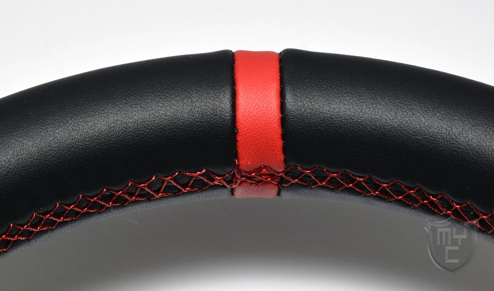 Diese Markierung dient jedoch nicht nur dazu, die aktuelle Lenkradstellung besser erkennen zu können, sondern durch die gewählte Farbgebung wird in Kombination mit den roten Ziernähten eine zur Basiseinheit passende Optik geschaffen.