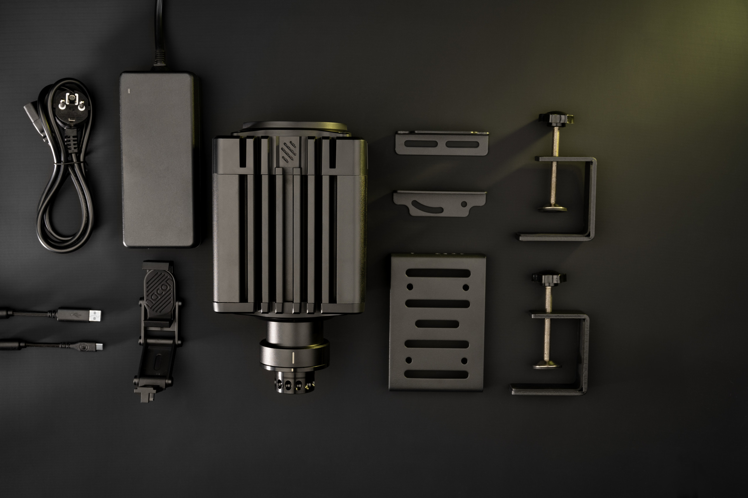 - Die Handbremse verfügt über eine 150-kg-Load-Cell. Sie hat ein Metallgehäuse und eine magnetische Abdeckung für einfachen Zugang zum Mechanismus, sodass der Widerstand mithilfe von zwei Elastomeren und einer Feder eingestellt werden kann. Die Handbremse kann in verschiedenen Positionen montiert werden, um sich an unterschiedliche Spielkonfigurationen und -präferenzen anzupassen. Sie verfügt außerdem über eine Klemme zur Befestigung an einem Tisch oder Schreibtisch.