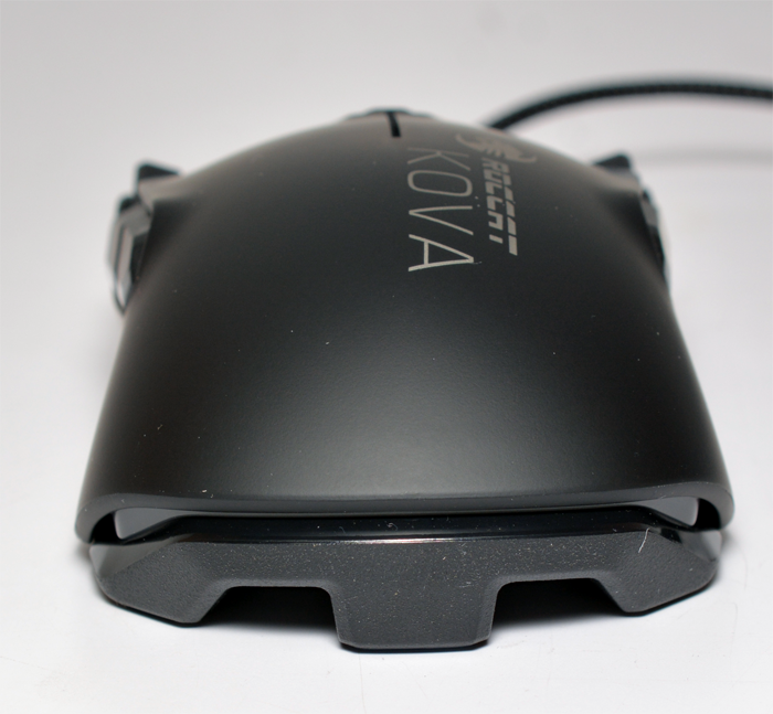 Betrachtet man die Kova AIMO einmal von ihrer Rückseite aus, so ist zu erkennen, dass die Handauflagefläche nicht, wie es bei fast allen anderen Mäusen der Fall ist, bis an die Unterseite der Maus geführt wurde. ROCCAT hat die schwarze Unterseite der Kova AIMO nach oben weitergeführt und hat mittels zwei in diesen Bereich eingelassene Vertiefungen eine Art Diffusor designt.