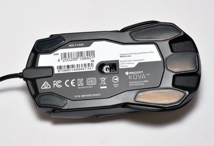 Mit einem Blick auf die Mausunterseite findet man im vorderen Bereich zwei und im hinteren Bereich gleich drei Gleitfüße vor. Der verbaute Pro-Optic Sensor R6 wurde mittig in die Unterseite der Kova AIMO eingearbeitet.