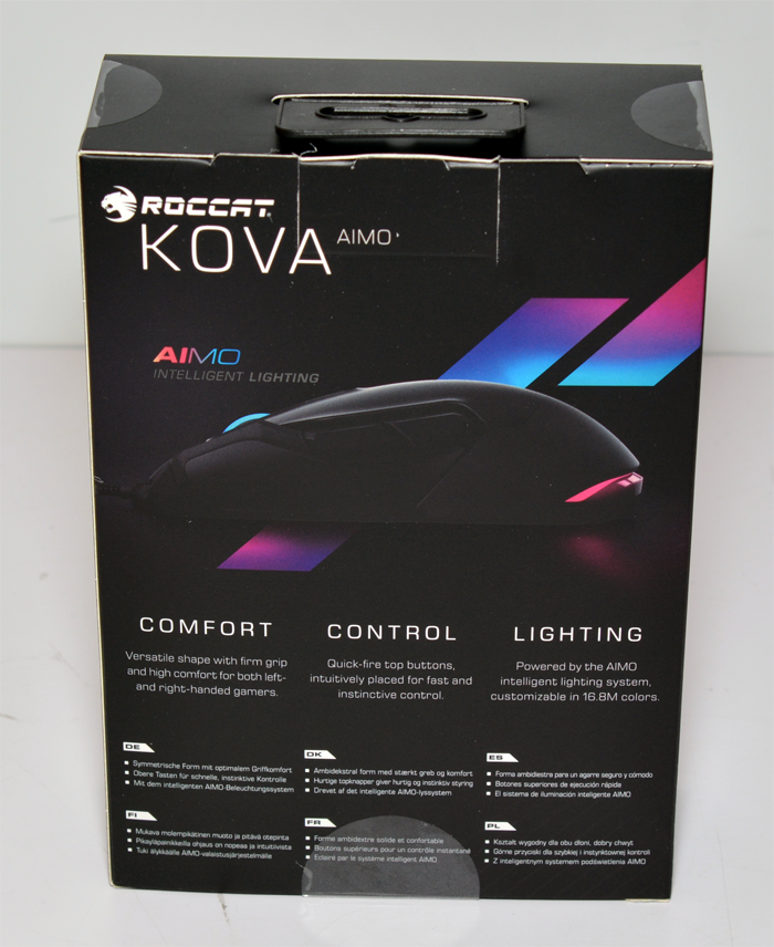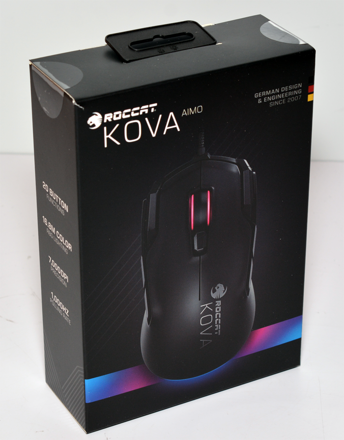 Die Kova AIMO wird von ROCCAT in einer schwarz – blau gehaltenen Verpackung geliefert. Auf der Verpackungsvorderseite wurde neben der Modellbezeichnung auch ein hochglänzendes Produktbild der Kova AIMO abgedruckt.