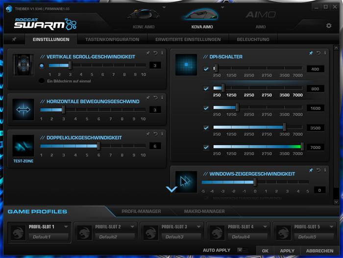 Im Softwareabschnitt „Einstellungen“ werden einem im rechten Bereich neben dem Schieberegler für die Mauszeigergeschwindigkeit die fünf DPI-Stufen angezeigt, welche mittels der hinter dem Mausrad verbauten Taste auswählen lassen.