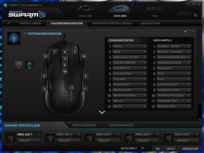 Im Bereich “Tastenkonfiguration” kann man, wie der Name schon vermuten lässt jeder Taste eine beliebige Funktion zuweisen. ROCCAT setzt auch bei der Kova AIMO die schon von anderen Produkten bekannte EASY SHIFT[+]-Funktion ein, wodurch es möglich ist, 11 der 12 Tasten mit einer Doppelfunktion zu belegen. Diese Doppelbelegung kann durch das gedrückthalten der EASY SHIFT[+]-Taste abgerufen werden. Die EASY SHIFT[+]-Funktion kann hierbei auch auf jede beliebige Taste gelegt werden.