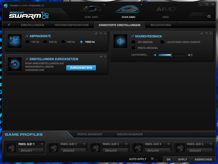 Im Bereich “Erweiterte Einstellungen” lässt sich die Polingrate einstellen und das schon von anderen Produkten aus dem Hause ROCCAT bekannte sound feedback aktiviert und konfigurieren.