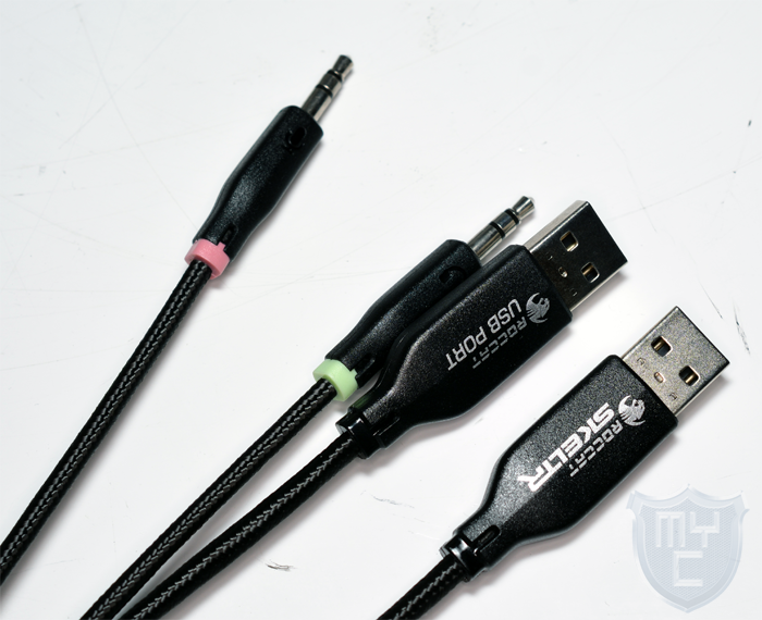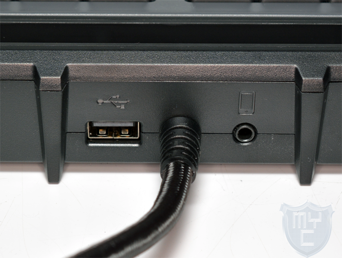 Betrachtet man die Tastatur einmal von ihrer Rückseite aus, so findet man zwischen den beiden schon angesprochenen Anschlüssen ein gesleevtes Anschlusskabel vor. Dieses wird kurz vor dem Ende in vier einzelne Kabel aufgesplittet. Neben zwei Klinkekabel verfügt das Anschlusskabel auch noch über zwei USB-Kabel.