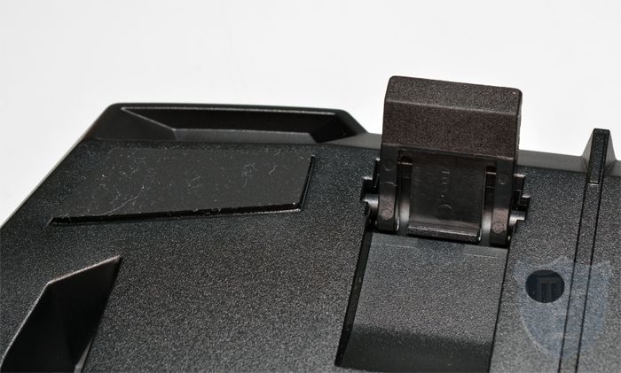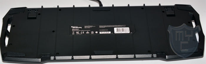 Betrachtet man die Tastatur einmal von ihrer Unterseite aus, so ist zu erkennen, dass sich diese Kunststoffstege bis auf die Vorderseite erstrecken. ROCCAT hat die Skeltr auf ihrer Unterseite zudem mit sechs Antirutschgummis ausgestattet, welche für einen sicheren Halt der Tastatur sorgen sollen.