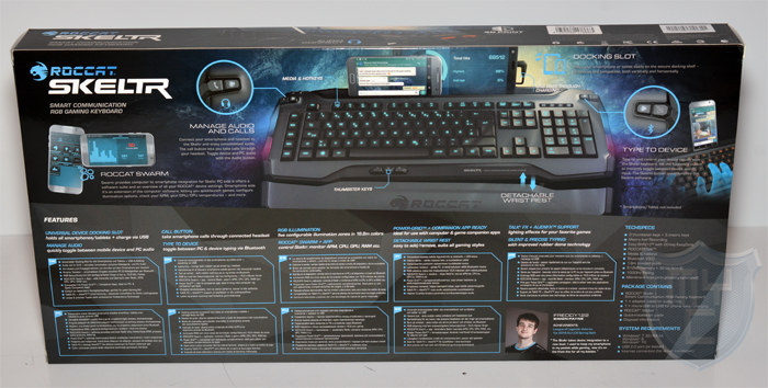 Die Skeltr wird von ROCCAT in einer Verpackung geliefert, welche überwiegend in den Farben Schwarz und Blau gehalten ist. Auf der Vorderseite der Verpackung ist ein großes Produktbild zu finden, welches einem schon einmal die wichtigsten Features der Tastatur näher bringt.