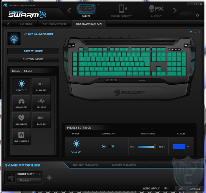 Im unteren Bereich findet man ein Element, welches mit einer recht ähnlichen Abbildung der Tastatur aufwartet. In diesem Softwareelement kann die Beleuchtungsart und Farbe der Tastatur frei definiert werden. Auch hier hat ROCCAT jedoch schon verschiedene Beleuchtungsversionen vordefiniert, auf welche man mit einem Klick zurückgreifen kann.