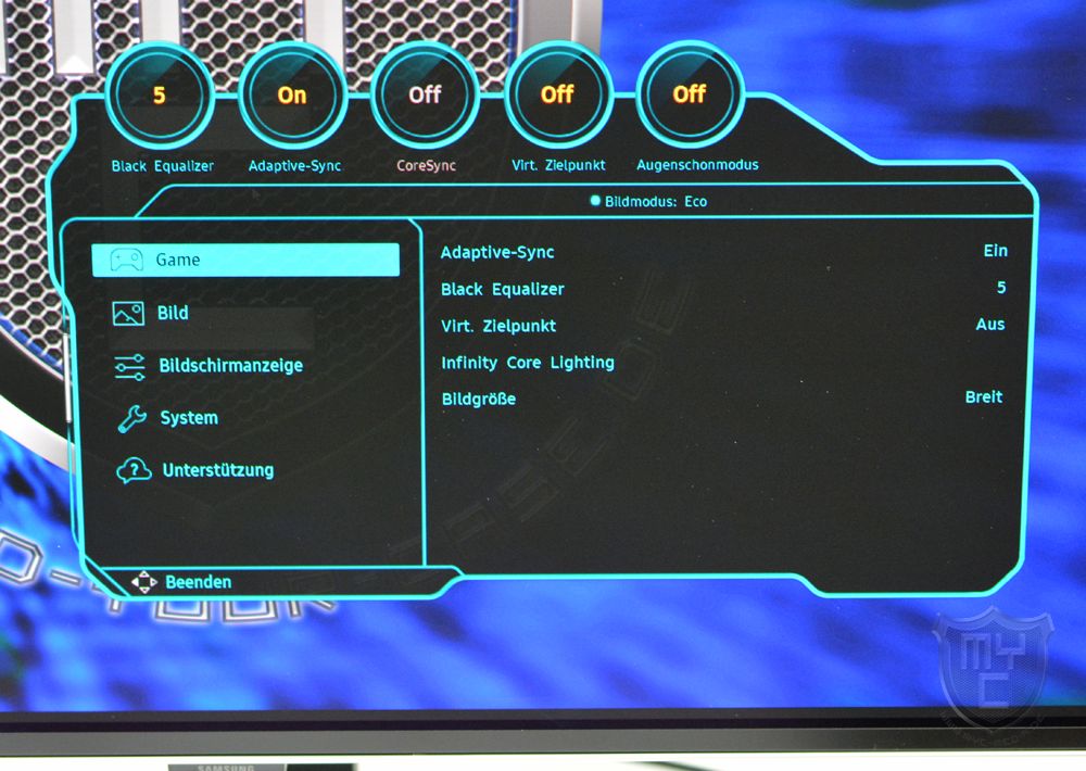 Auf zusätzliche Tasten, welche einen schnelleren Zugriff auf spezielle Gaming-Einstellungen ermöglichen, hat Samsung zwar verzichtet, jedoch hat Samsung das OSD so designt, dass man über ein vorgeschaltetes OSD-Menü schneller zum gewünschten Bereich gelangt.