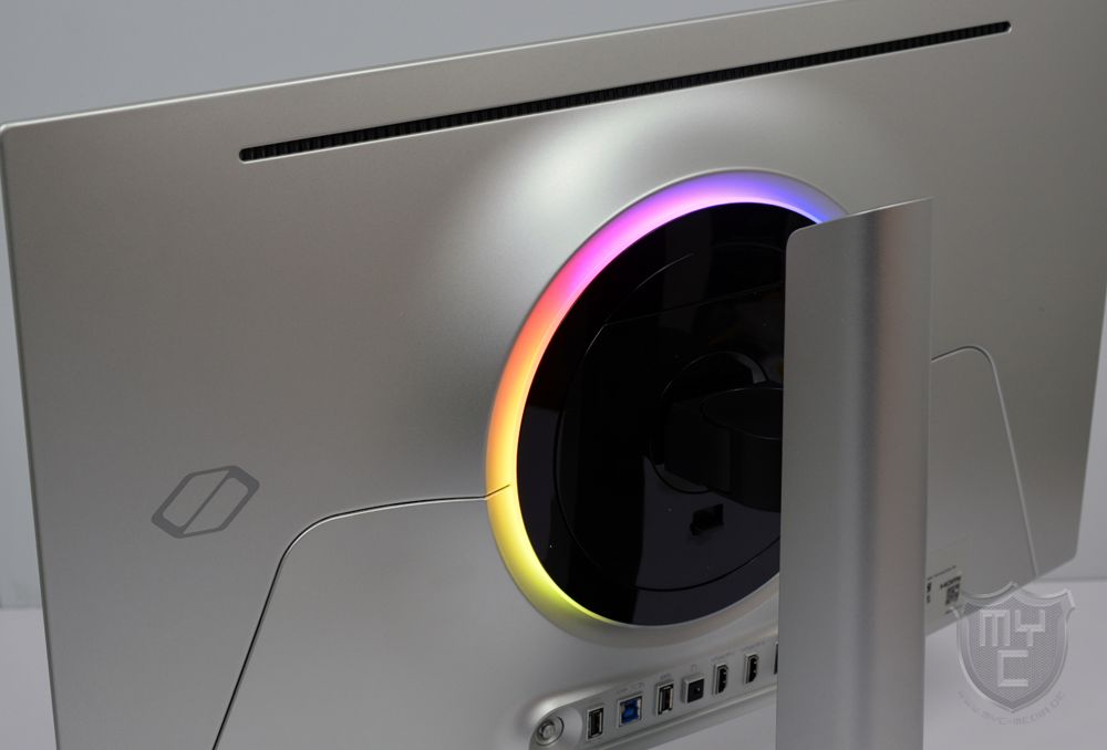 Die Gehäuserückseite wurde passend zum Design der Gehäusefront auf den ersten Blick sehr dezent ausgeführt. Samsung setzt an dieser Stelle auf ein leicht gewölbtes Aluminiumgehäuse, welches mittig mit einem kreisrunden Designelement ausgestattet wurde. Innerhalb des leicht transluzenten und mit einer ARGB-Beleuchtung ausgestatteten Kunststoffelementes wurden neben Gewinden zur Montage einer Vesa 100 x 100 Halterung auch Aufnahmepunkte für den Standfuß eingearbeitet.