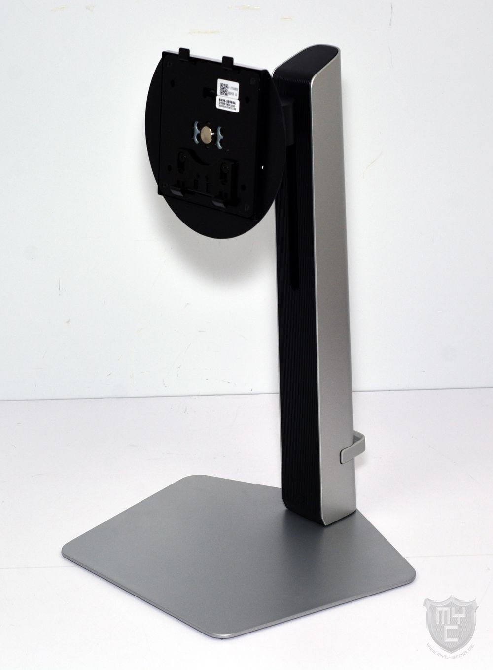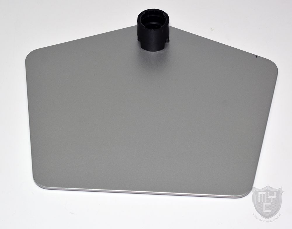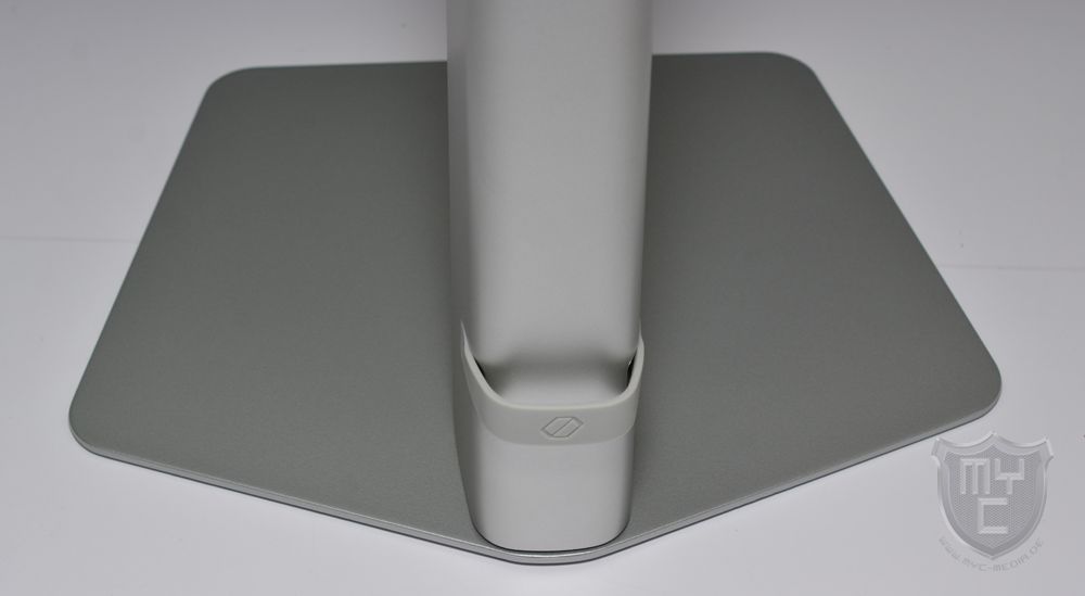 Zur Befestigung am Monitorarm wurde der aus Metall gefertigte Standfuß mit einer Schnellaufnahme ausgestattet, in welcher der Monitorarm durch eine Drehung um 90° automatisch einrastet.
