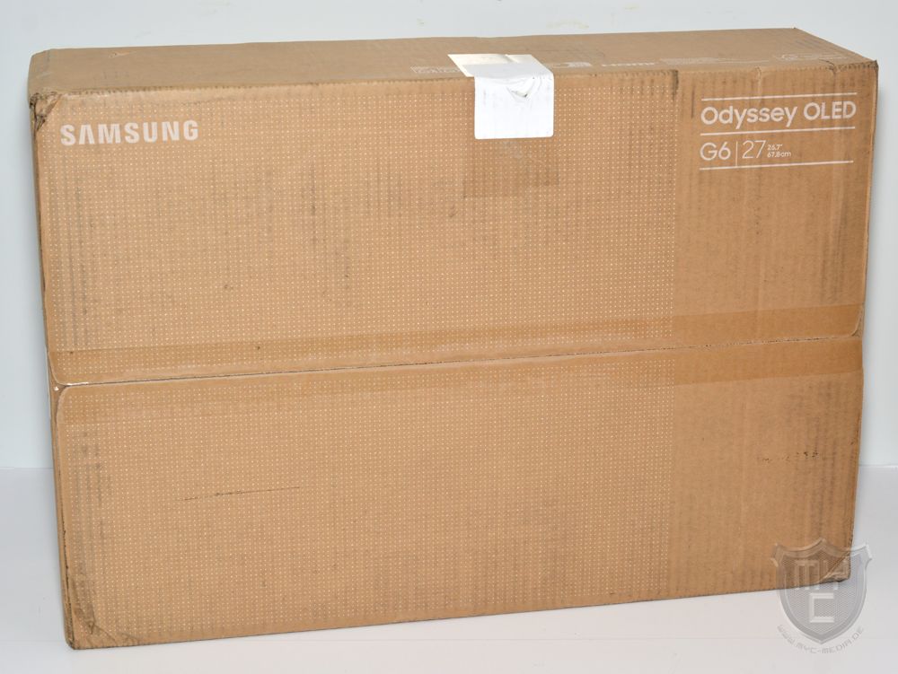 Der Odyssey OLED G6 (G60SF) wird von Samsung in einer neutralen Verpackung geliefert, welche auf der Vorder- sowie auch der Rückseite lediglich mit einem dezenten Hinweis auf die Modellbezeichnung des enthaltenen Monitors bedruckt wurde.