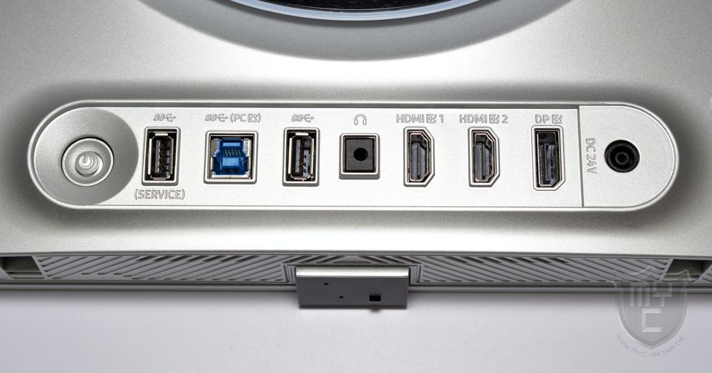 Zentriert unterhalb der Monitoraufnahme wurden neben dem Bedienelement auch die Signaleingänge untergebracht. Der Odyssey OLED G6 (G60SF) verfügt an dieser Stelle neben einem DisplayPort 1.4 und zwei HDMI 2.1 Anschlüssen auch über einen integrierten USB 3.0 Hub mit zwei Anschlüssen. Wo man integrierte Lautsprecher beim Odyssey OLED G6 (G60SF) vergeblich sucht, lässt sich der per HDMI oder DisplayPort an den Monitor übertragene Ton über einen integrierten 3,5-mm-Klinkeanschluss ausgeben.