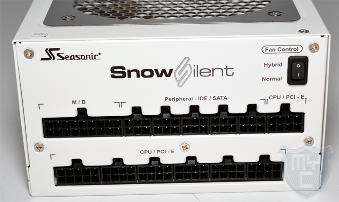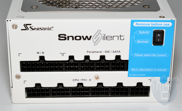 Oberhalb der einzelnen Anschlüsse wurde neben dem Seasonic Logo auch das Snow Silent Logo auf das Netzteil aufgedruckt. Alle Aufdrucke sind in den Farben Schwarz und Silber gehalten.