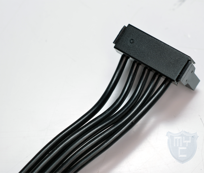 Die einzelnen Kabel werden bis auf den ATX-Kabelstrang alle als Flachbandkabel ausgeführt und verfügen daher nicht über ein Kabelsleeving. Der ATX-Kabelstrang hingegen wurde mit einem blickdichten Sleeving ausgestattet. Passend zu den Anschlüssen an dem Netzteil, sind auch alle Stecker sowie die Kabel selbst vollständig in schwarz gehalten.