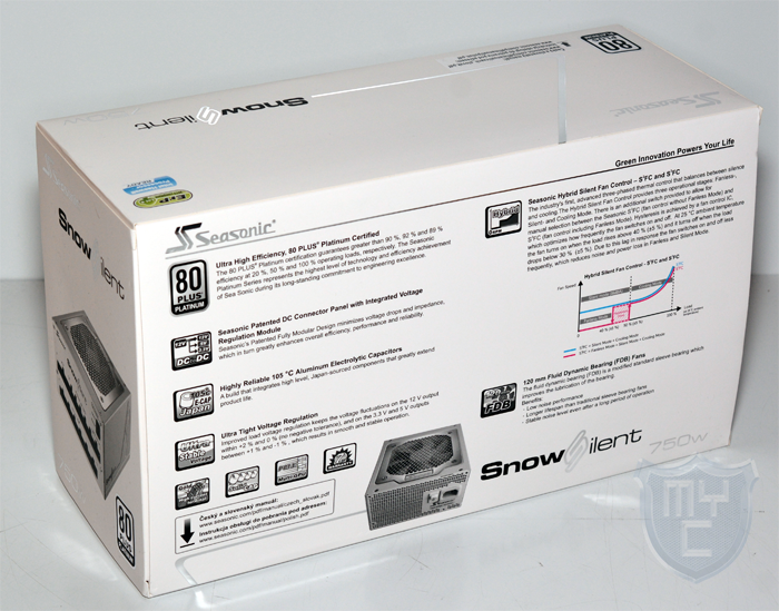 Das Snow Silent 750 wird von Seasonic in einer Verpackung geliefert, welche in einem glänzend weißen Design gehalten ist. Auf der Verpackungsvorderseite wurde neben dem Snow Silent Logo auch ein kleines Produktbild sowie ein Hinweis auf die Effizienz abgedruckt.